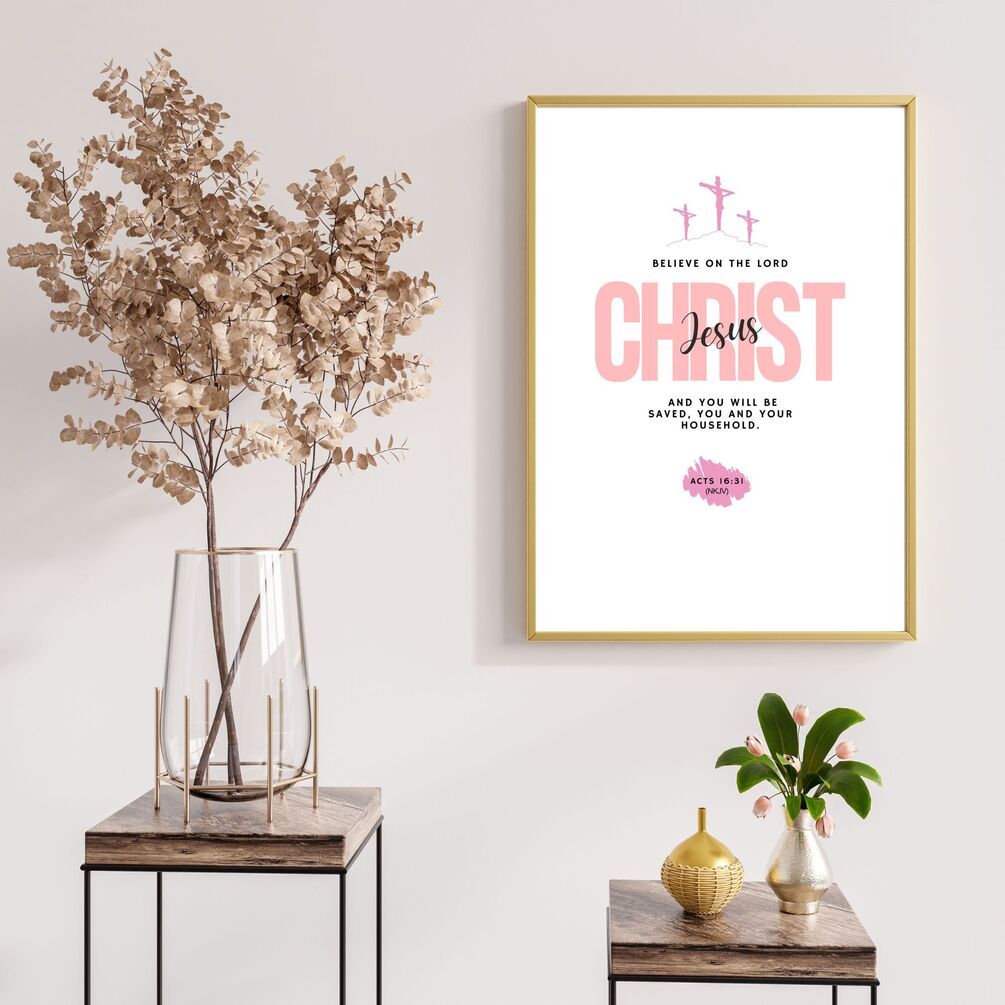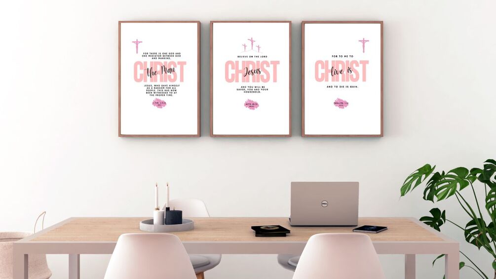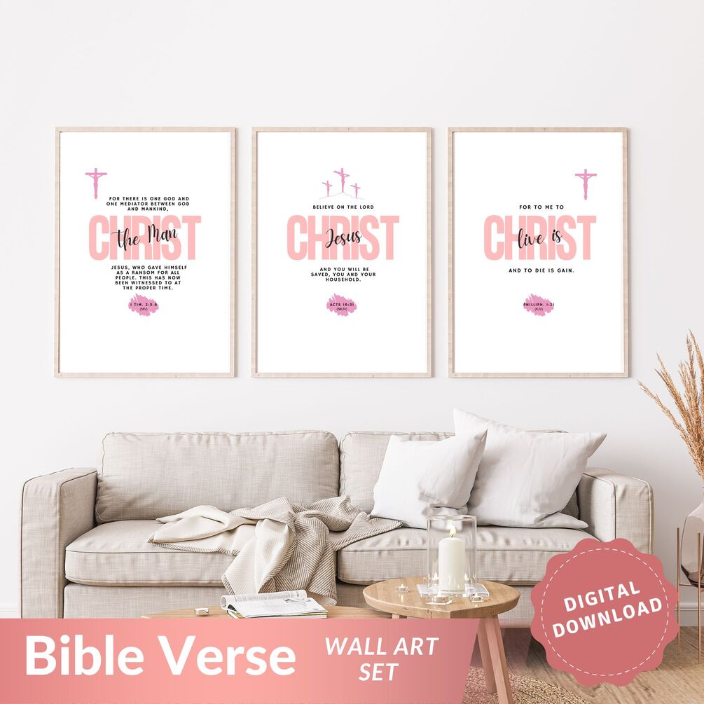 Printable Wall Art Set. Amazing Bible Verses about Christ connected as a beautiful 3 pieces Wall Art set. Verses: 1 Timothy 2:5.6; Acts 16:31; Philliphians 1;21.